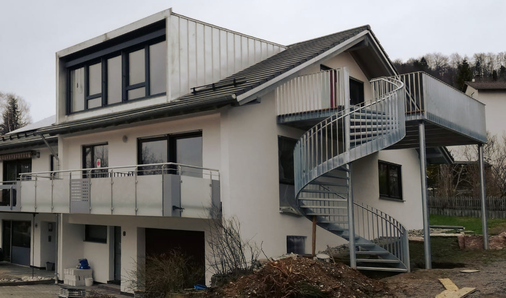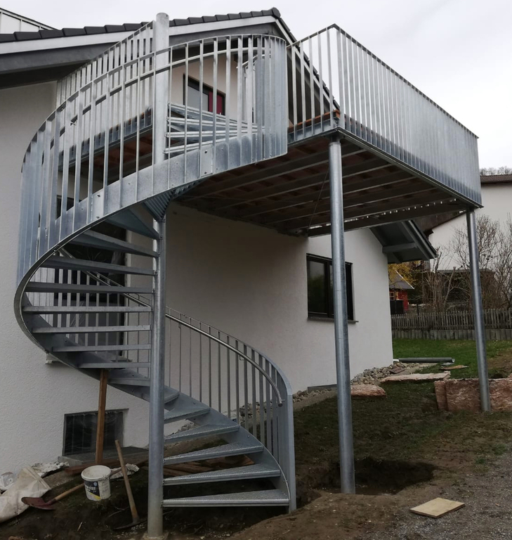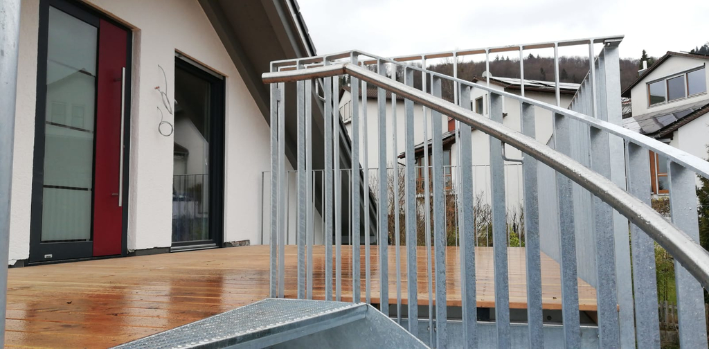 Spindeltreppe mit Gitterroststufen und Staktetengeländer mit V2A Handlauf.