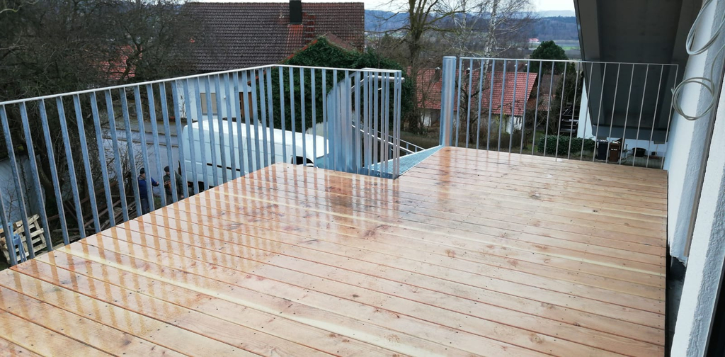 Balkon mit Staketengeländer und im Haus gefertigtem Lärchen-Belag.