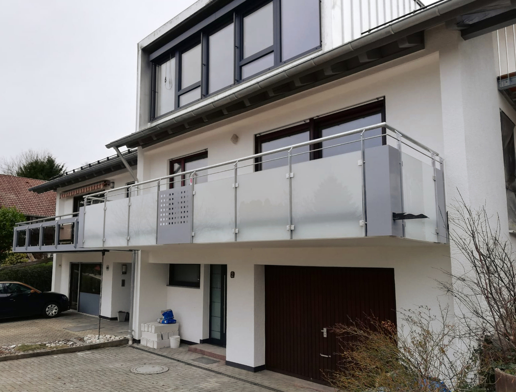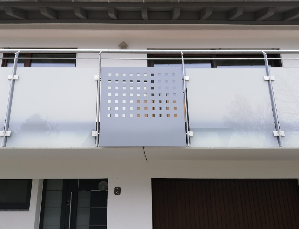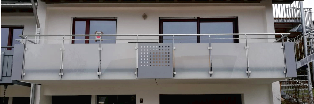 Flachstahlgeländer feuerverzinkt mit Glas- und Blechfüllung.